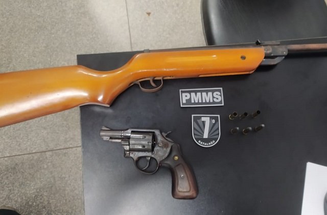 Na residência do autor foi apreendido 01 (um) Revolver TAURUS, calibre .38, com 06 (seis) munições, sendo três munições intactas e três munições deflagradas e uma carabina de pressão, com cabo de madeira, sem marca aparente.