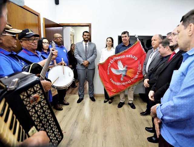 O governador Eduardo Riedel recebeu, nesta segunda-feira (05), a Bandeira do Divino, que faz parte da tradição religiosa e da história de Mato Grosso do Sul. A solenidade ocorreu na sala de reuniões da Governadoria. A Festa do Divino Espírito Santo iniciou em Coxim, sendo realizada há mais de 128 anos.