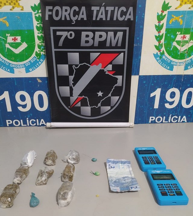 Com a autorização da dona da casa, a equipe policial entrou e fez a varredura minuciosa, vindo logo a encontrar oito porções de maconha no guarda-roupa, pesando aproximadamente 104g, que morador confessou ser para revender, juntamente com duas maquininhas de cartão.