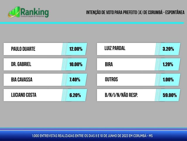 Na pesquisa espontânea, o ex-prefeito e ex-deputado estadual Paulo Duarte está à frente com 12% das intenções de votos, enquanto em segundo aparece Dr. Gabriel, com 10%. Logo atrás estão a ex-deputada federal Bia Cavassa, com 7,4%, e o vereador Luciano Costa, com 6,2%.