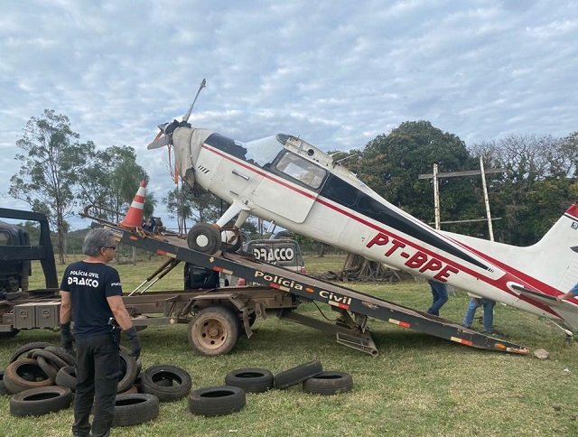 A Polícia Civil do Mato Grosso do Sul, por intermédio do DRACCO (Departamento de Repressão à Corrupção e ao Crime Organizado), no âmbito da Operação Hórus, do Ministério da Justiça, apreendeu ontem, quarta-feira, 05/07, uma aeronave Cessna Aircraft, prefixo PT-BPE, que estava sendo utilizada para o tráfico de drogas. A apreensão aconteceu na área rural do município de Porto Murtinho-MS.