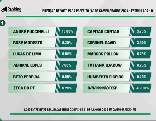 Para a pesquisa, o instituto ouviu, entre os dias 4 e 11 de julho de 2023, 1.200 moradores da cidade de Campo Grande, com 16 anos ou mais. O intervalo de confiança do levantamento é de 95%, e a margem de erro é de 2,75% para mais ou para menos.