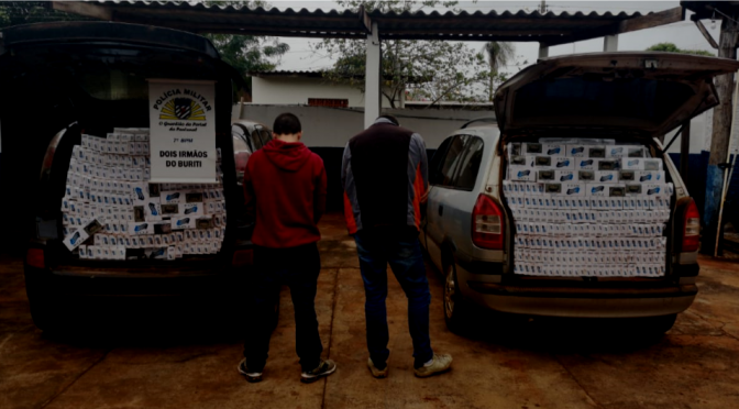 Por volta das 12 horas de ontem (23.05), a equipe de Radiopatrulha do 7º Batalhão de Polícia Militar apreendeu aproximadamente 5000 pacotes de cigarros contrabandeados, dentro de dois veículos que transitavam por estradas na Zona Rural de Dois Irmãos do Burití.