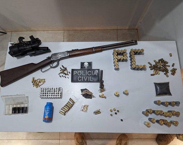 Na residência, as equipes localizaram uma carabina calibre .44 Magnum, marca Winchester, diversas munições e estojos de calibres variados, bem como acessórios relacionados a armas de fogo, incluindo lanternas, trilho de mira, escopo compacto e luneta.