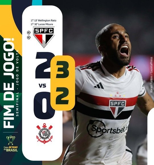 A partir daí o Tricolor diminuiu um pouco a sua rotação, mas o Timão continuava a mostrar muito pouco. E, aos 31 minutos, o São Paulo contou com o brilho de Lucas Moura para desequilibrar. O meia-atacante lançou na ponta direita para Wellington Rato, que cabeceou para o meio da área, onde o camisa 7 chegou em velocidade para escorar de cabeça e ampliar.