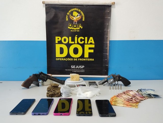 O DOF (Departamento de Operações de Fronteira) apreendeu na quarta-feira (16/08) dois revólveres, cocaína, pasta base de cocaína e maconha em uma casa na cidade de Rio Brilhante. Quatro pessoas que estavam no local foram detidas.