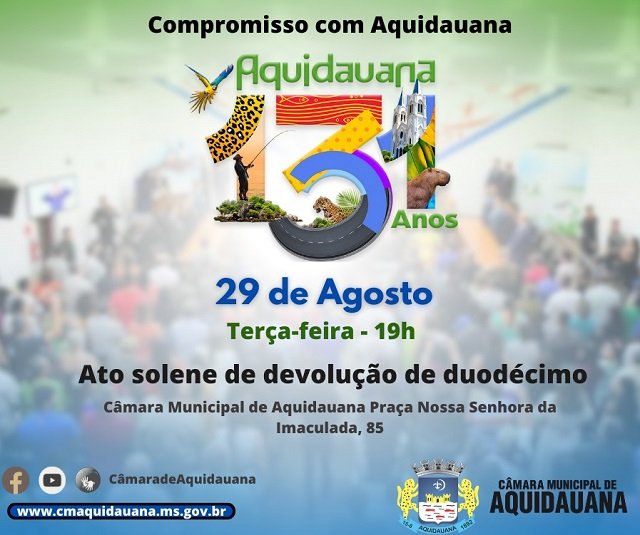 Nesta Sessão Legislativa às 19 horas de terça-feira, 29 de agosto, mês em que Aquidauana celebra 131 anos de fundação do municipio, o prefeito Odilon Ribeiro receberá do Poder Legislativo, o cheque simbólico do valor da devolução deste quadrimestre, maio, junho, julho e agosto. “Faremos a devolução de R$ 900.000,00 (Novecentos mil reais)”, detalhou o vereador presidente Nilson Pontim.