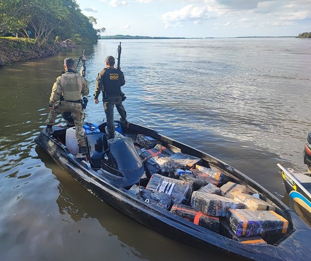 Uma ação conjunta entre policiais militares do DOF (Departamento de Operações de Fronteira) e de policiais federais da Delegacia da Polícia Federal de Naviraí, resultou na apreensão de 1.161 quilos de maconha no Rio Paraná, que eram transportados em uma lancha. Na ação ninguém foi preso.