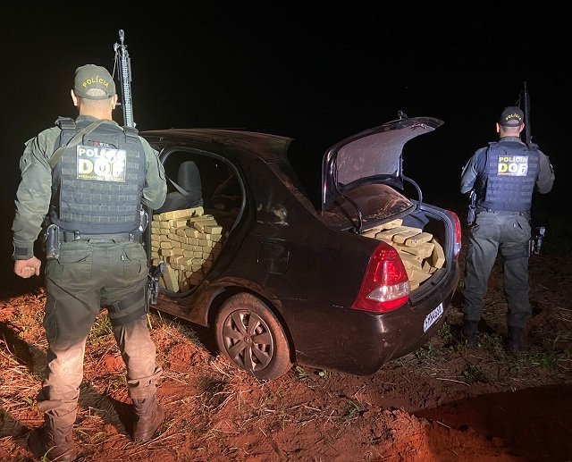 Os policiais faziam bloqueio na MS-162, zona rural do município, quando deram ordem de parada ao condutor do veículo, que não obedeceu e fugiu. Durante acompanhamento o motorista abandonou o carro carregado em meio a uma vegetação e correu a pé para uma mata.