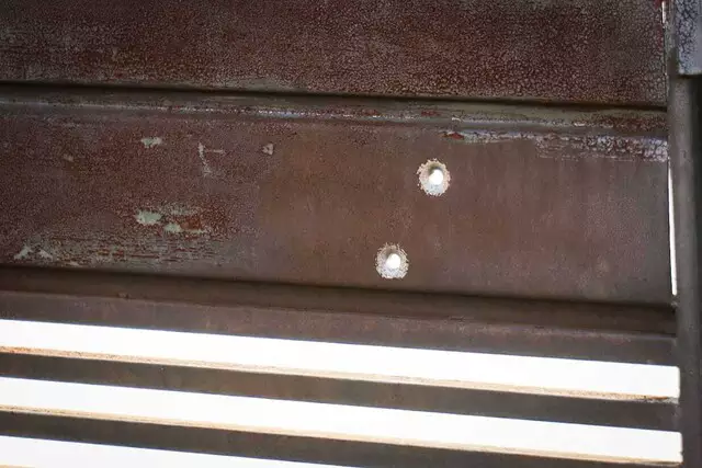 No portão da casa da vítima, a marca dos tiros disparados pelo policial (Foto: Henrique Kawaminami)