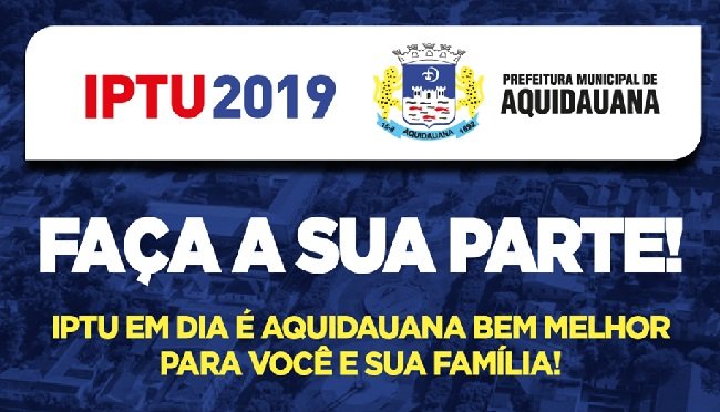 A Prefeitura de Aquidauana liberou a entrega dos carnês do Imposto Predial e Territorial Urbano referente ao ano de 2019 e o calendário de vencimento das parcelas. Quem optar em pagar à vista o IPTU 2019, em cota única, até o próximo dia 10 de junho, terá desconto de 20% no pagamento, mas para ter direito a esse desconto o morador precisa estar adimplente, ou seja, sem dívidas com a prefeitura até 31/12/2018.