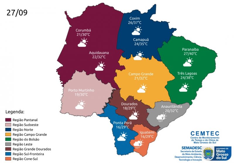 Em Corumbá, na região pantaneira, a mínima será de 21°C e máxima de 30°C; Aquidauana terá variação entre 22°C e 32°C. No sudoeste, Porto Murtinho amanhece com 19°C e atinge os 30°C. No norte, Coxim terá 26°C cedo e alcançará os 37°C ao longo do dia. No Bolsão, Três Lagoas registra 24°C pela manhã e 38°C de tarde.