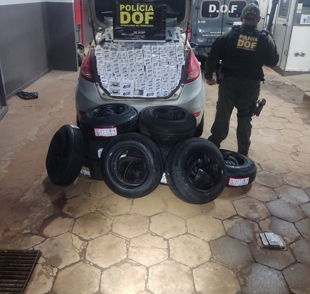 Policiais militares do DOF (Departamento de Operações de Fronteira) apreenderam, na tarde de sexta-feira (29) um veículo Ford Fiesta carregado com 375 pacotes de cigarros e 60 pneus de origem estrangeira, sem a documentação de regularidade fiscal.