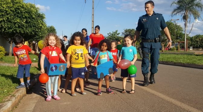 Os policiais militares e guardas municipais realizaram uma pequena caminhada com as crianças da creche na via pública, e assim aos poucos elas vão assimilando o ordenamento do trânsito, que acima de tudo o que se deve sobressair é a educação no trânsito.