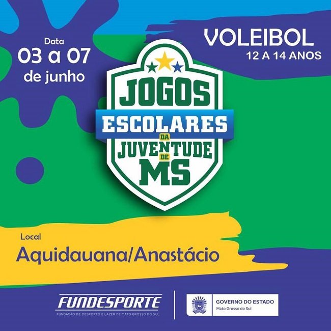 Aquidauana e Anastácio sediarão os jogos na modalidade voleibol, categorias feminina e masculina, com cerca de 500 atletas, na faixa etária de 12 a 14 anos. Nos dias 04 a 07 de junho, acontecerão as partidas que definirão os vencedores dessa etapa estadual da modalidade voleibol. Ainda será divulgada a tabela oficial dos jogos, com locais e horários. O encerramento e premiação irá acontecer no dia 07 de junho no poliesportivo de Aquidauana.
