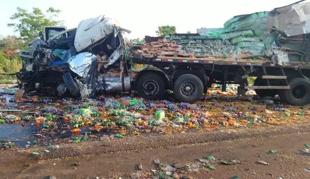 A colisão foi de frente e as causas do acidente ainda estão sendo apuradas. Tanto a carga de refrigerante quanto a de milho ficaram espalhadas na pista.