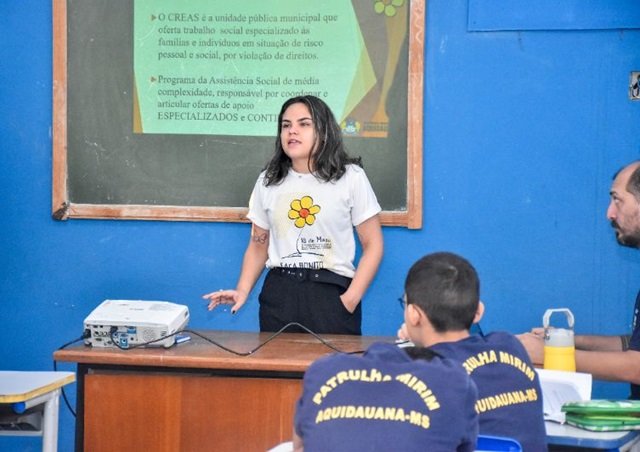 Em alusão ao “Dia Estadual de Enfrentamento à Violência e Exploração Sexual de Crianças e Adolescentes”, a equipe do Centro de Referência Especializado de Assistência Social (CREAS) de Aquidauana esteve na manhã desta sexta-feira (20), no projeto Patrulha Mirim.