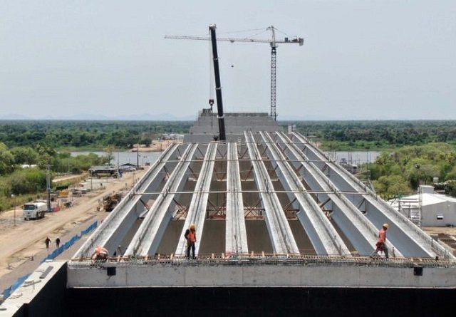 Cerca de 8 vigas de concreto pesando 30 toneladas foram colocadas na ponte do lado Paraguaio na semana passada, segundo informações do Ministério do Paraguai