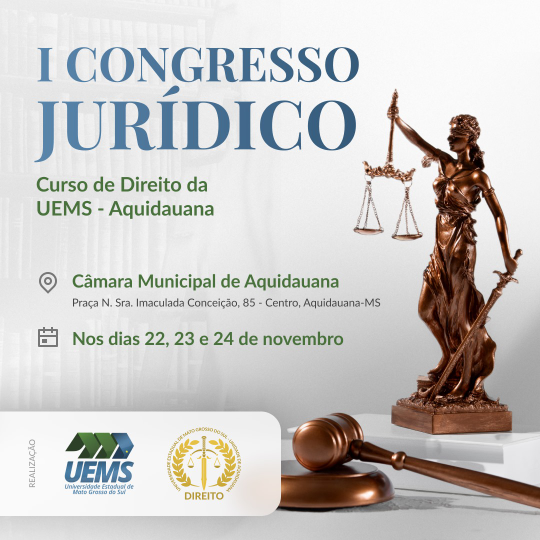No mês de novembro acontece o 1º Congresso Jurídico do Curso de Direito da Unidade Universitária de Aquidauana, entre os dias 22 e 24 de novembro, no plenário da Câmara Municipal do município.