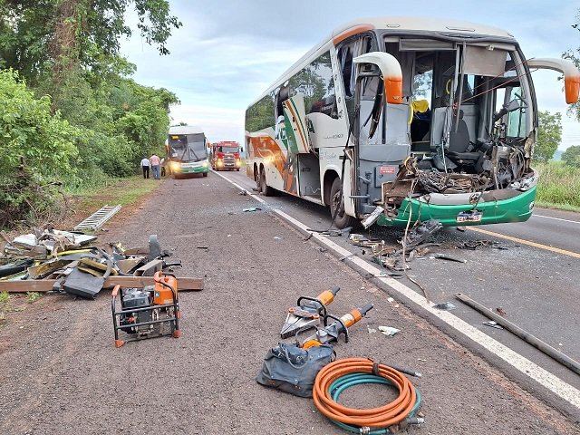 O acidente ocorreu por volta das 03h15min, sendo que o motorista do ônibus ficou preso nas ferragens e foi resgatado pela equipe.
