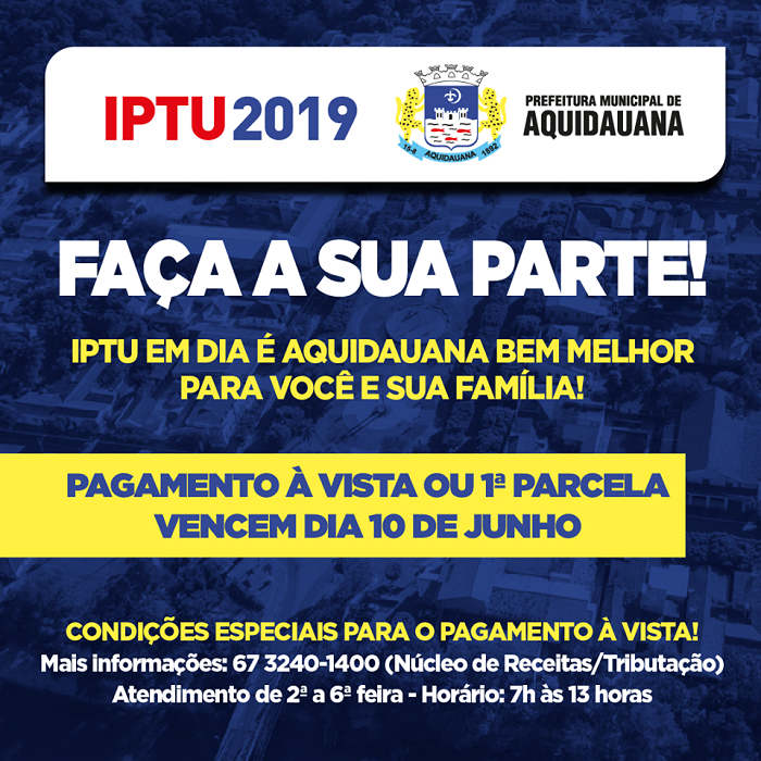 A Prefeitura de Aquidauana liberou a entrega dos carnês do Imposto Predial e Territorial Urbano referente ao ano de 2019 e o calendário de vencimento das parcelas. Quem optar em pagar à vista o IPTU 2019, em cota única, até o próximo dia 10 de junho, terá desconto de 20% no pagamento, mas para ter direito a esse desconto o morador precisa estar adimplente, ou seja, sem dívidas com a prefeitura até 31/12/2018.