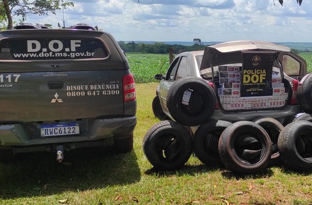 Policiais militares do DOF (Departamento de Operações de Fronteira) apreenderam, na tarde de sábado (16) próximo ao assentamento Itamaraty, um veículo Renault Logan carregado com 550 pacotes de cigarros e 45 pneus adquiridos no Paraguai, sem a documentação legal exigida no Brasil.