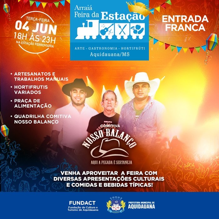 Junho chegou e há que diga que é mês mais saboroso e festivo do ano, tudo isso porque tem as festas juninas. Aproveitando esse clima festivo, em Aquidauana, hoje (04), tem “Arraiá da Feira da Estação”, com apresentações culturais, show-baile com o Grupo “Nosso Balanço” e barracas com comidas e bebidas típicas e a entrada é franca.