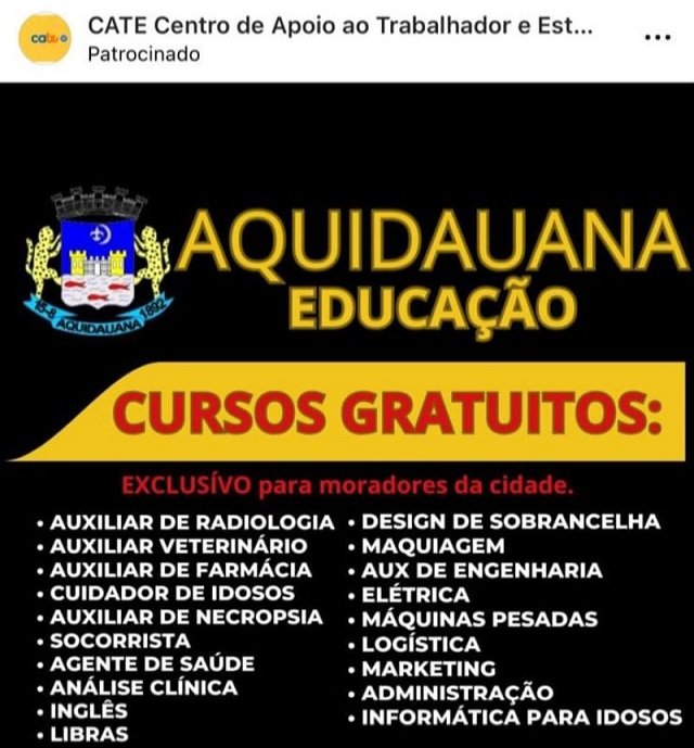 O perfil CATE – Centro de Apoio ao Trabalhador e ao Estudante está divulgando propaganda ofertando cursos em diversas áreas. Nas propagandas, que estão sendo veiculadas via WhatsApp, patrocinadas no Facebook e no Instagram, eles estão usando INDEVIDAMENTE a marca (logo) do município, que é o Brasão da Prefeitura.