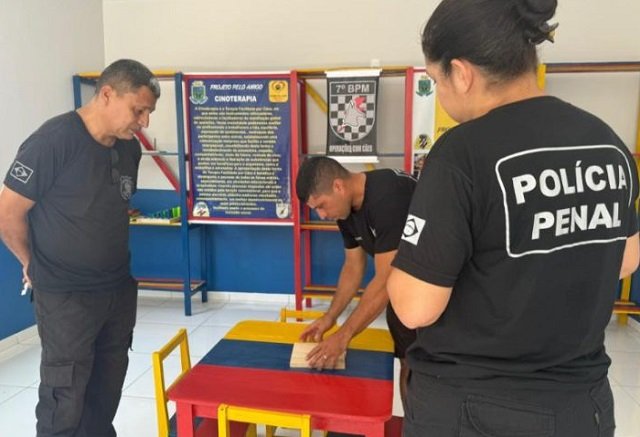 Confeccionados com mão de obra de reeducandos na marcenaria do Estabelecimento Penal de Aquidauana, móveis em madeira agora auxiliam os trabalhos desenvolvidos pelo projeto “Pelo Amigo – Cinoterapia”. A iniciativa é uma de várias desenvolvidas pelas unidades da Agepen (Agência Estadual de Administração do Sistema Penitenciário), com foco na retribuição social.