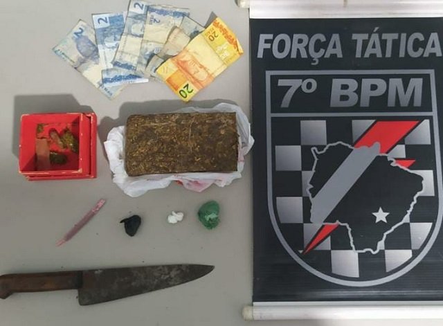 Foi apreendido ao todo: 376g de substância análoga à maconha e uma trouxinha de 0,40g de substância análoga à pasta base de cocaína, algumas cédulas de dinheiro e uma faca.