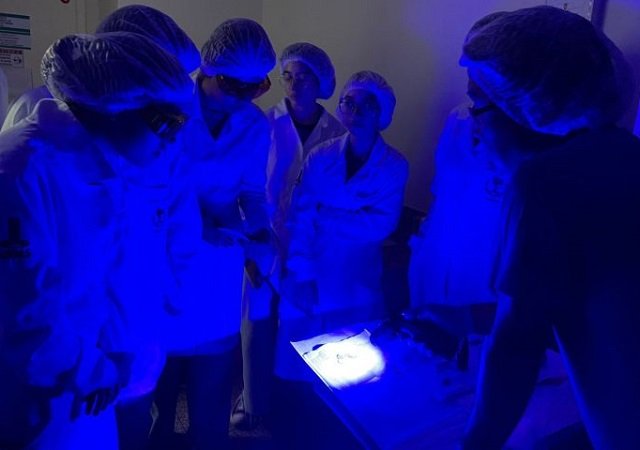 Acadêmicos da UFMS durante demonstração no laboratório, sob penumbra e luz totalmente azul. Tal item é utilizado para identificar elementos comprobatórios em crimes.