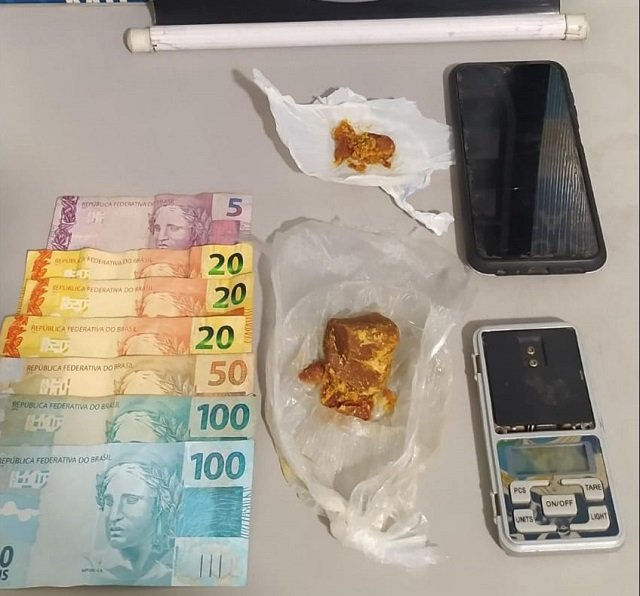 Dentro do armário da cozinha, os policiais encontraram uma sacola contendo uma pedra de substância análoga à pasta base de cocaína, pesando aproximadamente 41,4 gramas, uma balança de precisão, R$45 reais em notas fracionadas e R$270,00 na carteira do autor.
