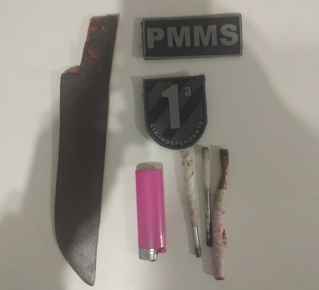 Diante da fundada suspeita, policiais realizaram abordagem ao indivíduo, sendo que durante realização da busca pessoal foi localizada uma faca com o cabo quebrado no bolso da calça, 03 (três) apetrechos para uso de crack (cachimbo) e 01 (um) isqueiro.