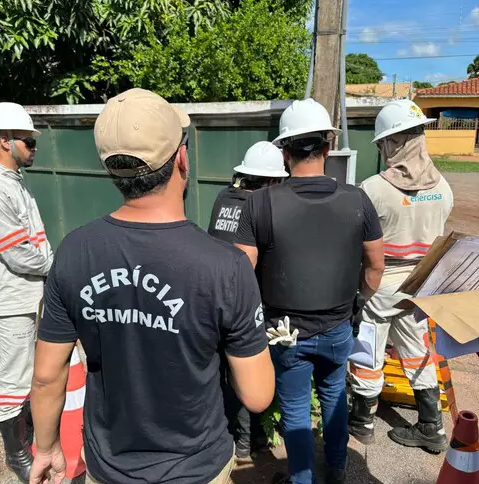 Equipe de peritos criminais e funcionários da Energisa fiscalizam poste fraudado no interior. (Foto: Reprodução/PCMS)