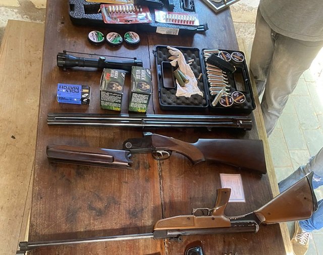 Então, na manhã desta sexta-feira, duas equipes policiais deslocaram até a residência e local de trabalho do suspeito, oportunidade que foi possível localizar na casa dele várias armas de fogo e munições, entre as quais pode se destacar: uma pistola Taurus 9 mm, que o suspeito admitiu ter disparado na ocasião, além de uma espingarda calibre .12, um revólver calibre .32, e uma espingarda calibre .20, que se encontrava com cano serrado artesanalmente.