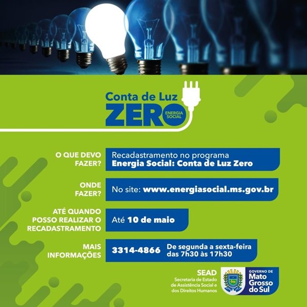 om a sanção da lei 6.199, publicada nesta quinta-feira (14) no Diário Oficial do Estado, o Governo do Estado amplia o prazo para recadastramento no programa Energia Social: Conta de Luz Zero. A ação permite ainda mais de 50 dias para que os beneficiários façam seu recadastramento por meio do site www.energiasocial.ms.gov.br.