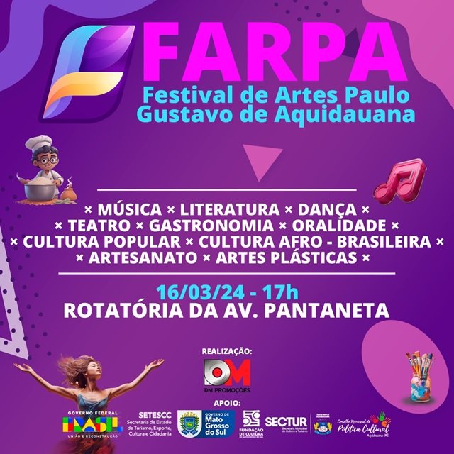 Neste sábado, dia 16 de março, em Aquidauana, será realizada a 1ª edição do Festival de Artes Paulo Gustavo (FARPA), na rotatória da Avenida Pantaneta, a partir das 17h e com entrada gratuita.