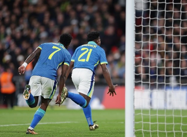 Onze minutos depois, Andreas Pereira colocou Vini Jr na cara do gol com ótimo passe. O atacante finalizou e parou em Pickford, mas no rebote, bem posicionado, Endrick completou para as redes. Foi o primeiro gol do jovem atacante do Palmeiras, já negociado com o Real Madrid, pela Seleção Brasileira – a principal.