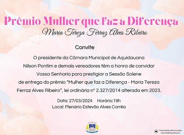 Hoje, quarta-feira (27) a Câmara Municipal de Aquidauana fará realizar Sessão Solene de entrega do ‘Prêmio Mulher que faz a diferença Maria Tereza Ferraz Alves Ribeiro’, às 19 horas no Plenário Estevão Alves Corrêa.