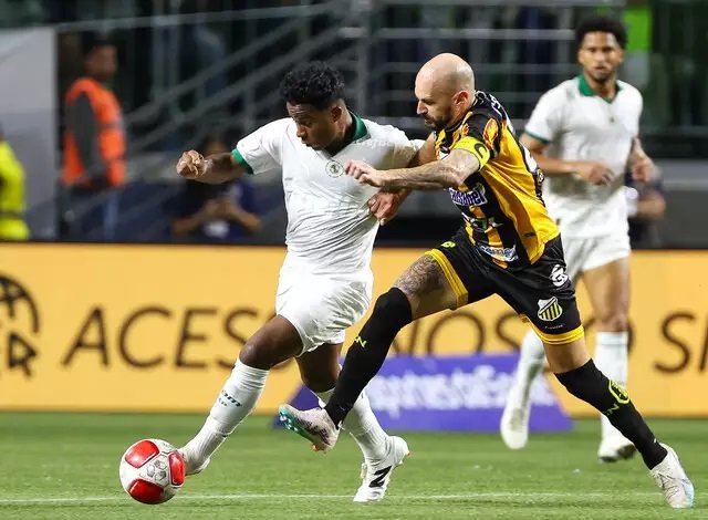 Endrick disputa a posse da bola durante confronto com o Novorizontino. (Foto: Fábio Menotti/Palmeiras)