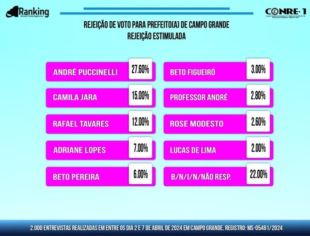 Na pesquisa de rejeição, o líder é André Puccinelli, com 27,6%, sendo que nas anteriores os percentuais foram 25,2% e 26%, respectivamente, seguido por Camila Jara, com 15%, nas anteriores os percentuais foram 7,3% e 12,4%, respectivamente, e Rafael Tavares, com 12%, sendo que ele não foi citado nas anteriores.