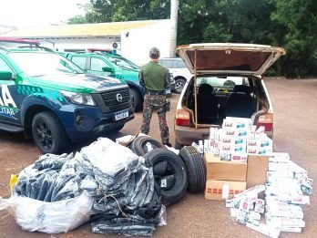 Diante da atitude suspeita, os policiais acionaram sinais sonoros e luminosos da viatura, nesse momento o veículo empreendeu fuga por cerca de três quilômetros, até desistir e parar. Realizada a abordagem no interior do veículo, foram encontradas 07 caixas de cigarro, 17 pneus, um pacote fechado de roupas de frio, todos os produtos sem nota fiscal de origem e de marca estrangeira, aparentemente oriundos do Paraguai.