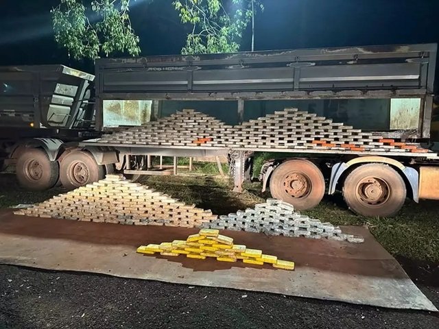 Após acessar o local, os policiais encontraram 370 kg de pasta base e 25 kg de cloridrato de cocaína. Questionado, o motorista disse ter entregue os reboques a um desconhecido e depois recebeu o veículo já com a droga oculta.