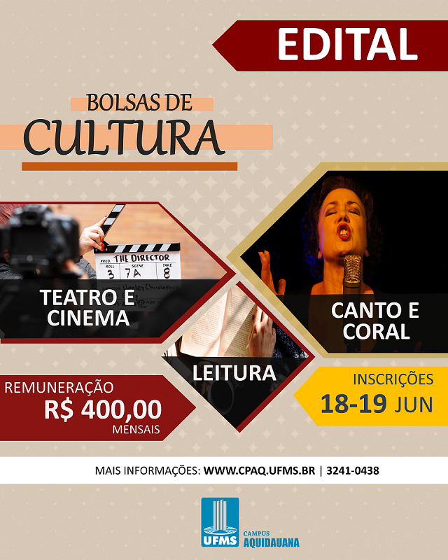Estudantes da UFMS poderão se candidatar às vagas abertas para bolsas de cultura no Câmpus de Aquidauana (CPAQ). Há vagas em três projetos e acadêmicos de qualquer curso podem se candidatar.