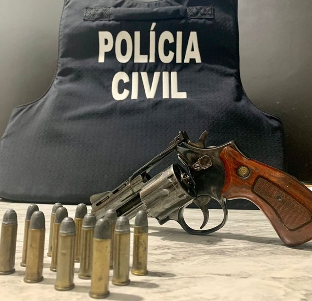 Na residência, foi encontrada um revólver Taurus .38 e 12 munições do mesmo calibre, os quais pertenciam ao autor N.L.N., de 79 anos, sendo esse preso por posse de arma de fogo de uso permitido.