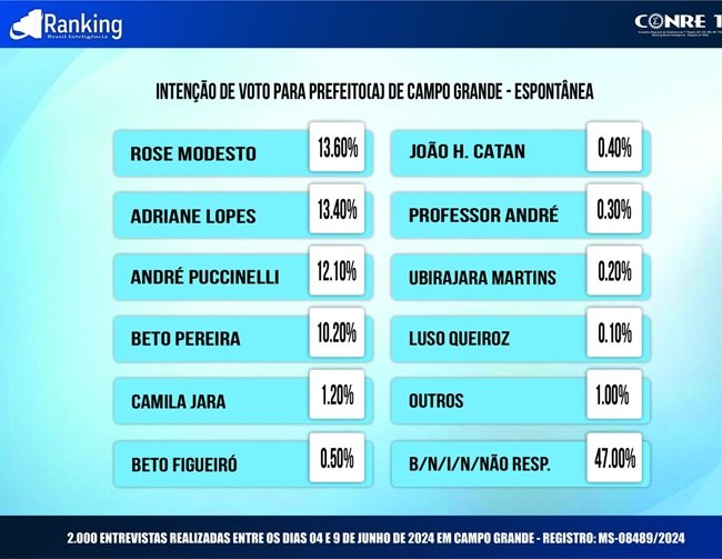 Na espontânea, a liderança é da ex-deputada federal Rose Modesto (União Brasil) com 13,6% das intenções de votos dos entrevistados, enquanto nas pesquisas anteriores realizadas em janeiro, março, abril e maio os percentuais foram 11,4%, 12%, 16,2% e 13%, respectivamente.