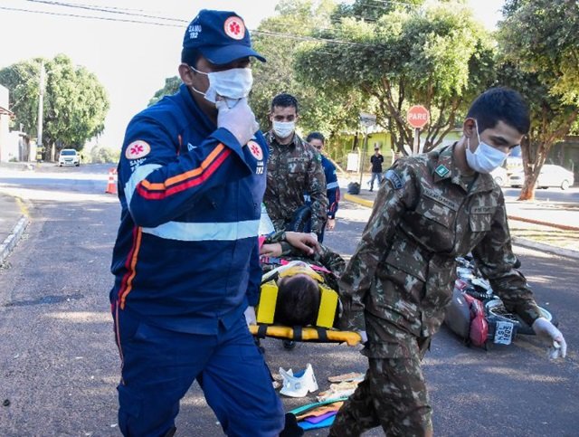Com uma intensa movimentação na rua Aniceto Rondon ao lado do Detran de Aquidauana, na manhã desta sexta-feira (21), o Serviço de Atendimento Móvel de Urgência (SAMU), da Secretaria Municipal de Saúde e Saneamento, encerrou o 2º treinamento de Atendimento Pré-Hospitalar (APH), para militares do 9º BECmb e servidores do SAMU.