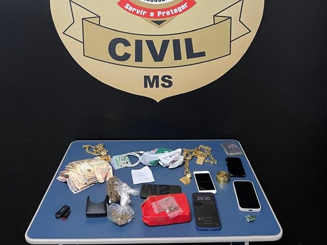 Durante a busca e apreensão, autorizada pelo Juízo da Comarca de Mundo Novo, foram apreendidos aparelhos telefônicos, cédulas de dinheiro sem valor comercial (notas falsas) e drogas.