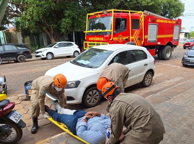 O homem estava sentado no meio fio, consciente e orientado, apresentando hematoma e escoriações no joelho direito, escoriações na mão direita e queixa de dor na região cervical.