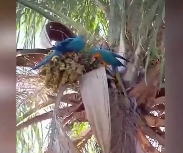 Uma moradora do bairro Tiradentes está convivendo com um casal de araras no quintal de casa. Uma delas está, provavelmente, machucada. Segundo Priscila Romano, de 35 anos, as aves apareceram há algumas semanas para se alimentar em um pé de bocaiuva, que fica parte na casa da vizinha, parte na casa dela.